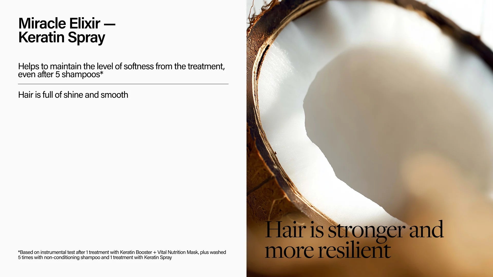 Protect your hair with Miracle Elixir Keratin Spray, a lightweight, leave-in treatment designed to extend the life of in-salon Miracle Elixir Keratin Booster treatment. Maintain strength, smoothness, and shine. Infused with repairing plant-based keratin, this multitasking spray helps rebuild weakened strands and defend against daily damage.