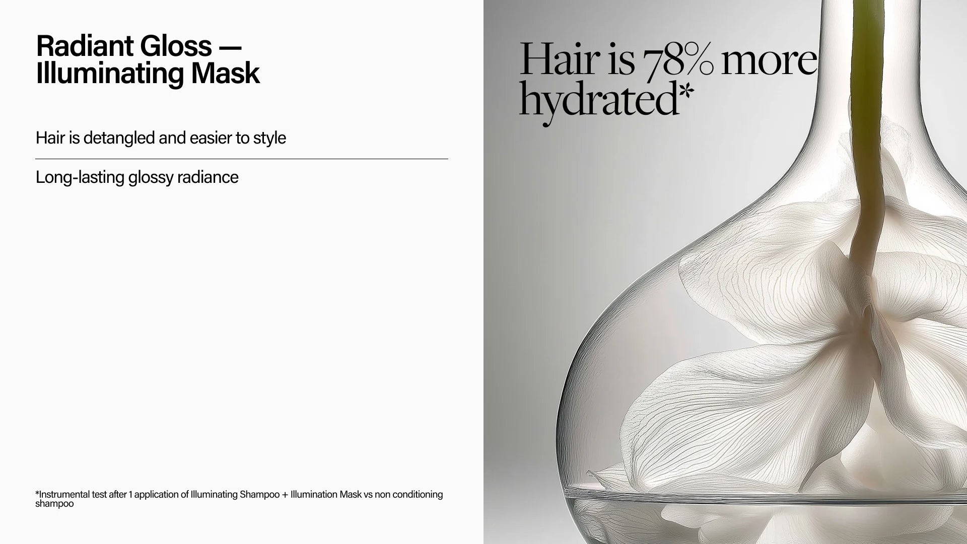 This glow-giving hair formula transforms dull hair into shiny silk. Experience deep-conditioning care with Radiant Gloss Illuminating Mask. Designed to restore brilliance, boost hydration, and coat the hair cuticle in vital lipids, leaving strands soft with a dazzling, light-reflecting shine.