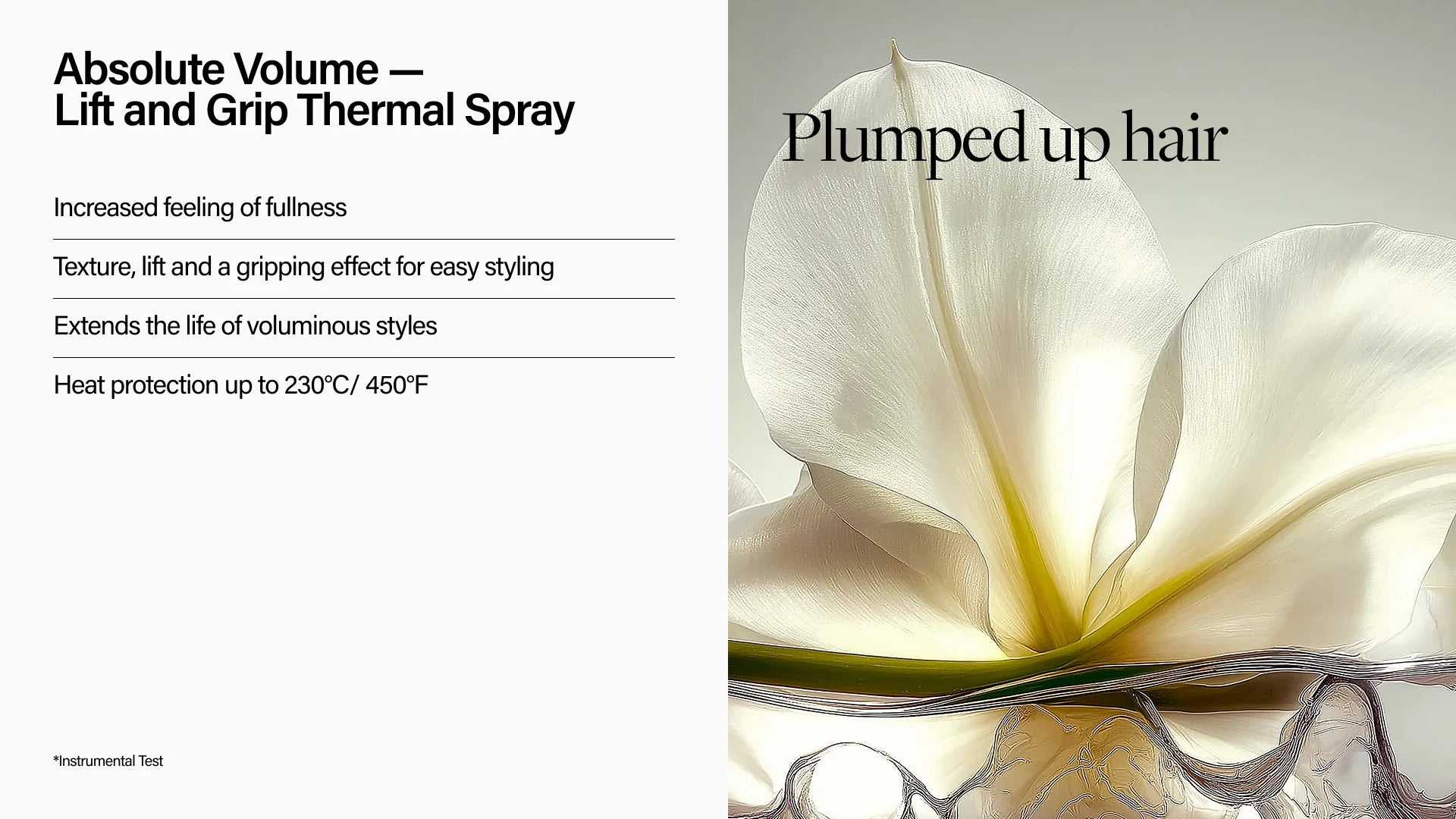 Achieve new heights with this texturizing treatment, Absolute Volume Lift and Grip Thermal Spray gives grip, lift and flexible hold for voluptuous, touchable hair that lasts.