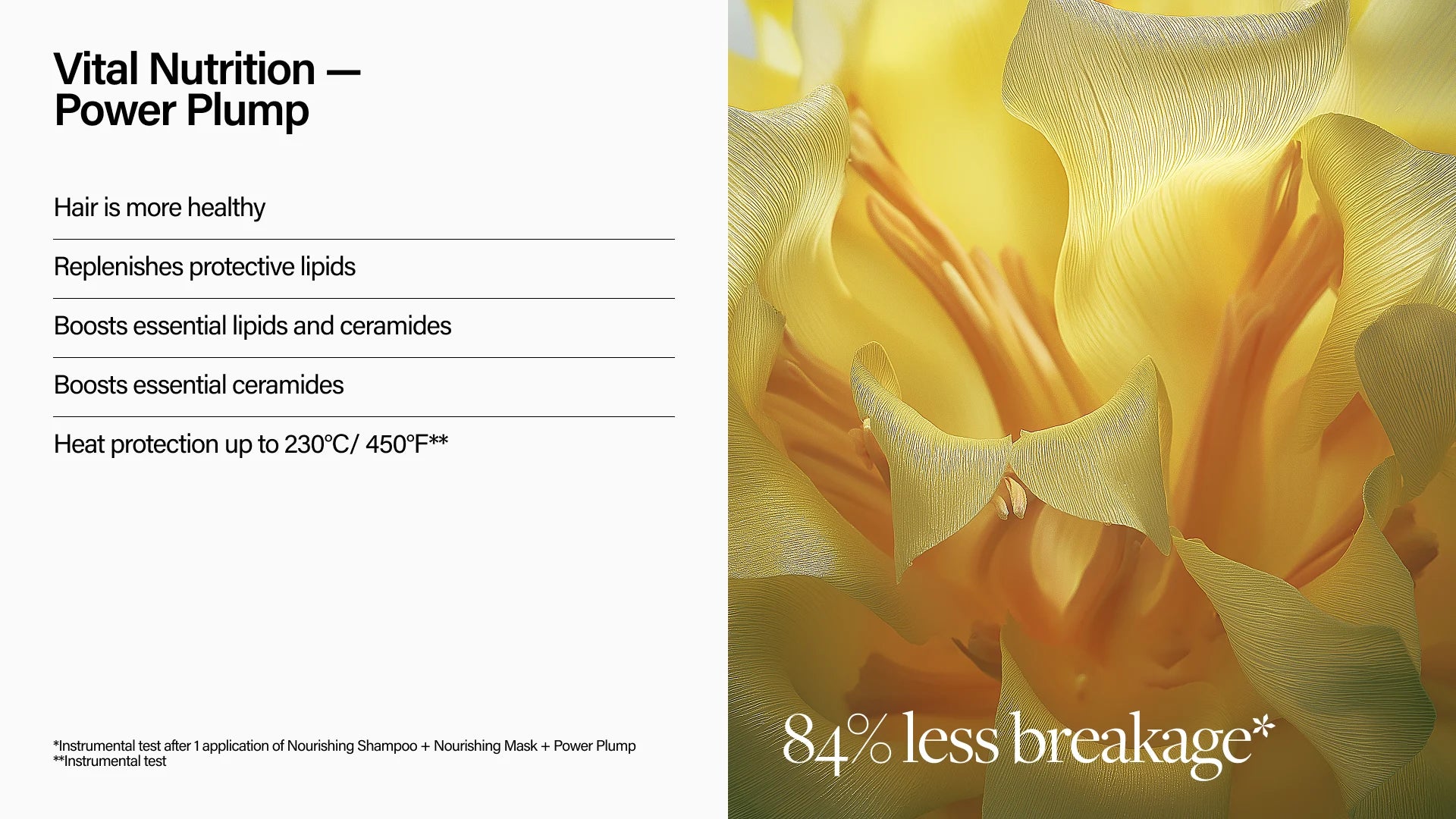 Plump up hair with Vital Nutrition Power Plump super concentrated gel-cream, anourishing leave-in treatment designed to fill gaps in the hair fiber, lock in moisture, and smooth the cuticle. Perfect for dry, damaged, or chemicallytreated hair, this advanced formula evens out porosity, making hair moreresilient, manageable, and visibly healthier.