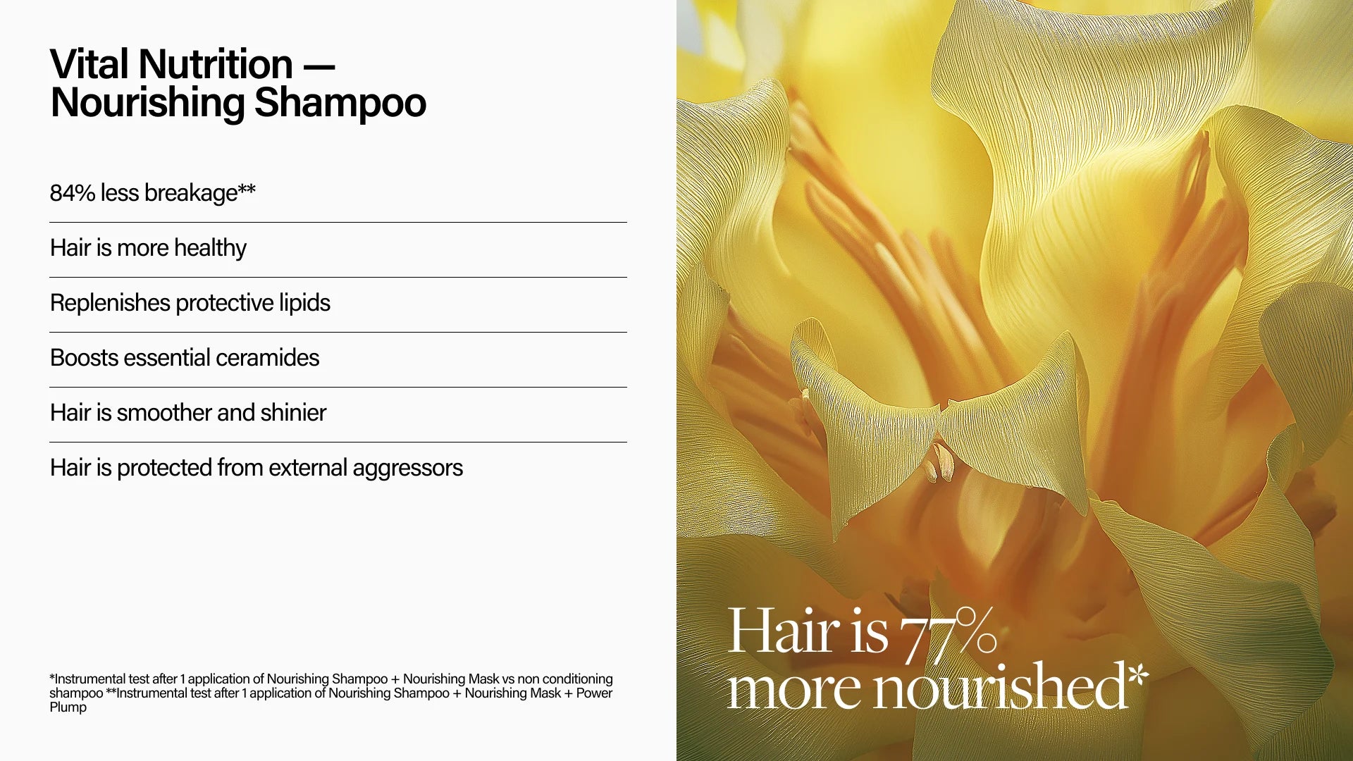 Indulge your hair with Vital Nutrition Nourishing Shampoo, designed to gently cleanse while replenishing moisture and restoring softness. Ideal for dry, brittle, or dehydrated hair, this rich yet lightweight formula leaves your strands feeling strong, silky, and beautifully nourished.​